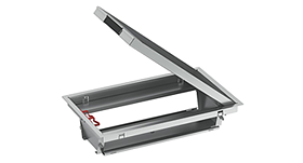 Golvbox OL 50 12 moduler med uttagen placerade åt sidorna så att eventuell smuts som kommer ner i boxen inte hamnar i uttagsbrunnarna, utan på den rostfria plåten. Det gör att det är enkelt att dammsuga boxen från smuts.
